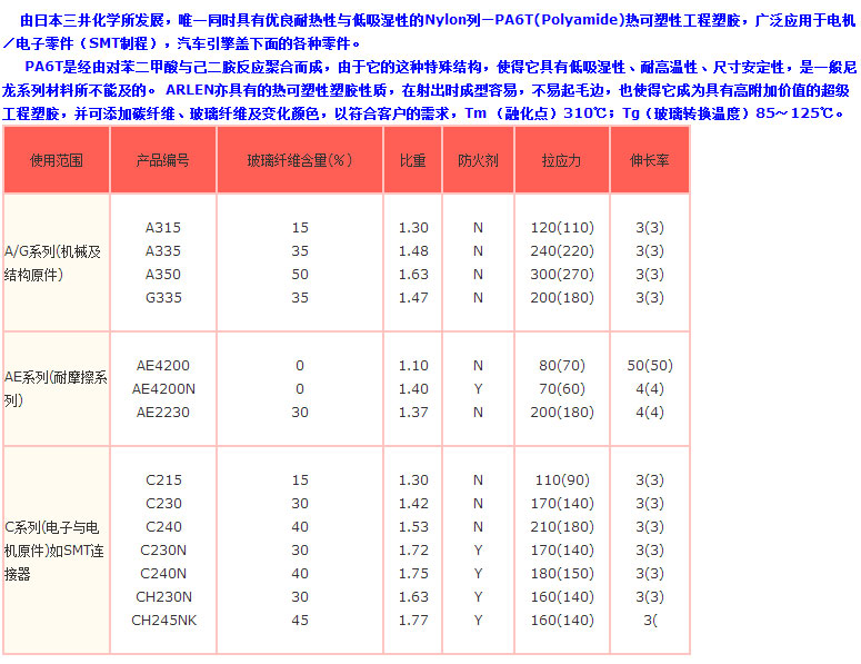 日本三井化學ARLEN系列PA6T熱可塑性工程塑膠物性